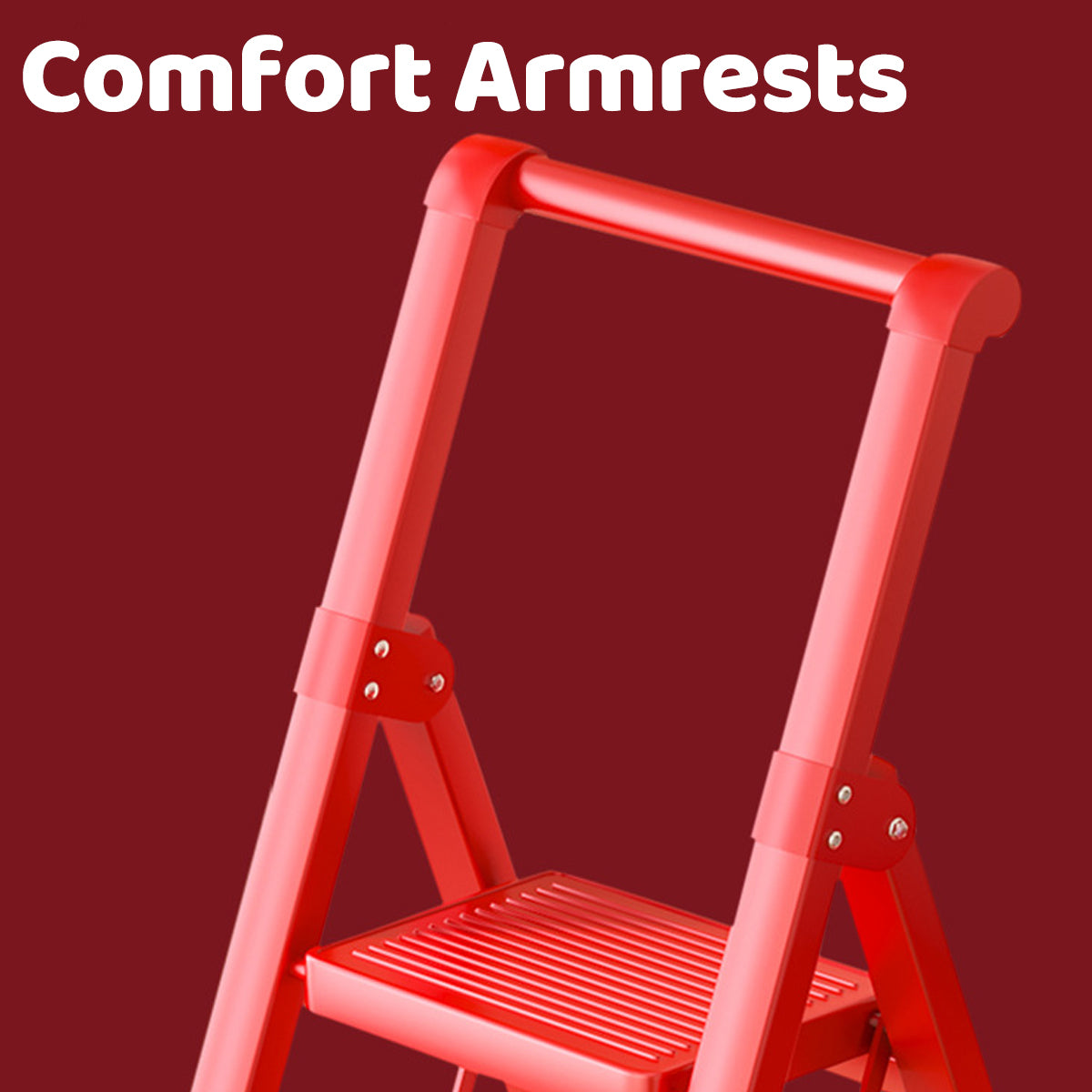 This 5-step folding ladder is built from durable carbon steel to provide dependable strength and stability for everyday tasks around the home, kitchen, or garage. Finished in a high-visibility red coating, it features a quick-fold structure that allows for easy storage without sacrificing safety. Designed with user comfort and balance in mind, the ladder includes supportive armrests, textured anti-slip steps, and wide horseshoe-shaped foot pads to ensure confident use on indoor surfaces.
