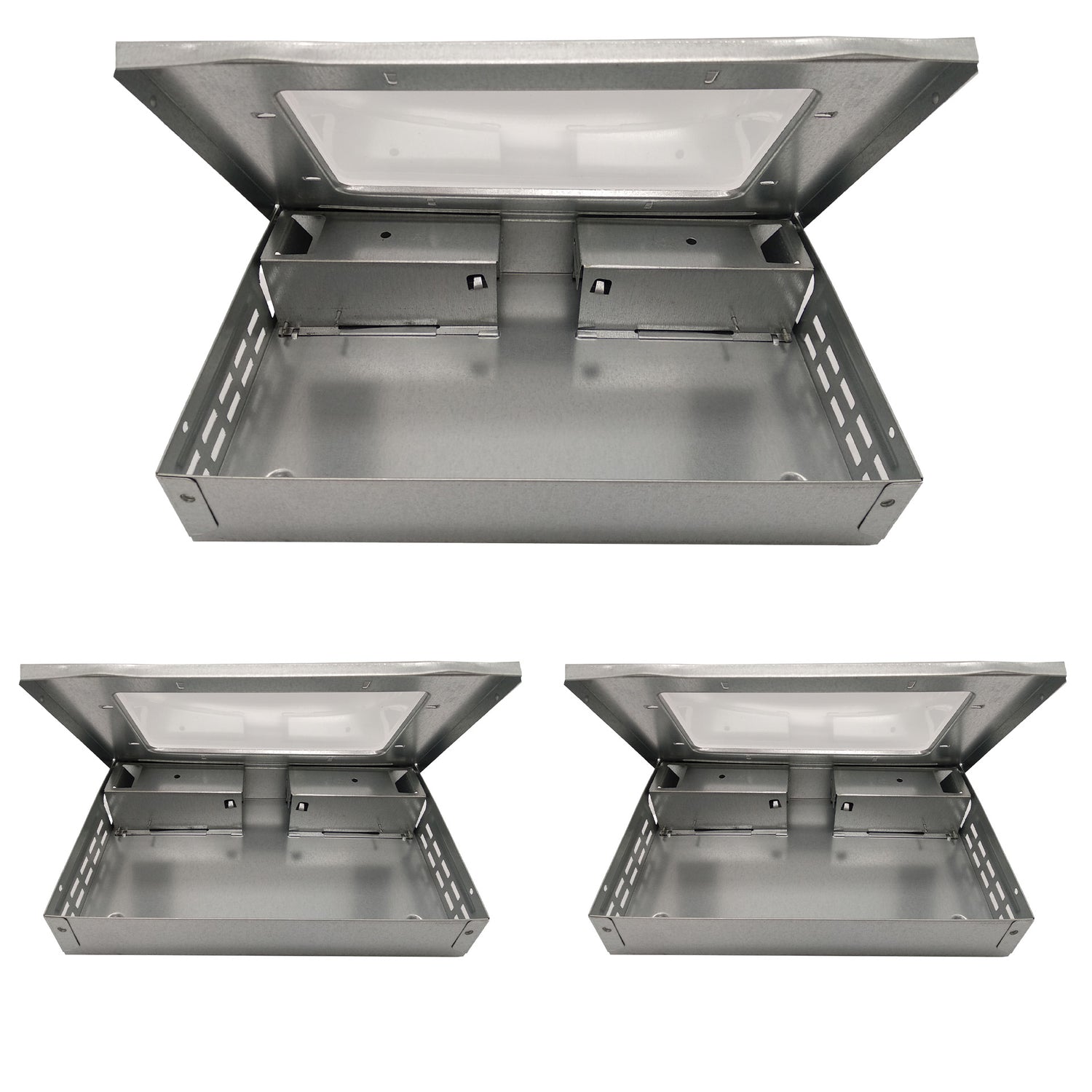 This humane, reusable mouse trap station provides a safe and efficient solution for rodent control. Constructed from durable metal with a transparent lid, it allows easy visual inspection without opening. The trap features multiple entry points and internal compartments to attract and securely contain mice without harm. Ideal for homes, kitchens, storage areas, or commercial spaces, it ensures a clean, non-toxic, and pet-safe method to manage infestations.