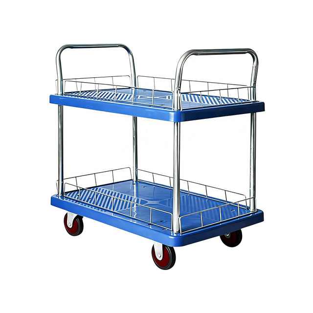 The two-tier flatbed structure supports organised transport of goods, tools, and maintenance supplies within warehouse and logistics operations. Protective metal guardrails help keep items stable during movement across facility floors. Double handles provide controlled manoeuvring when transporting loads through aisles and work areas. The steel construction supports repeated use in industrial and warehouse environments with a rated load capacity of 150kg. Rubber wheels allow smooth, low-noise movement across concrete, tiled, and other common warehouse surfaces.