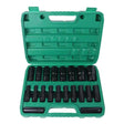 All components are stored within a molded green transport case that maintains positional retention for each socket, reduces the risk of loss, and supports portability for field repairs. The set is directly compatible with standard 1/2-inch drive ratchets, breaker bars, and powered drivers, enabling adaptable application across multiple tool platforms.