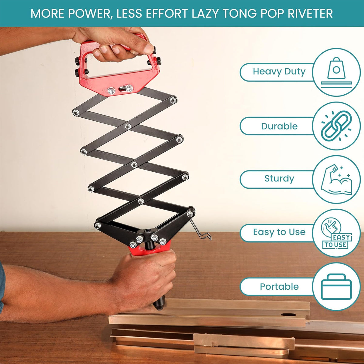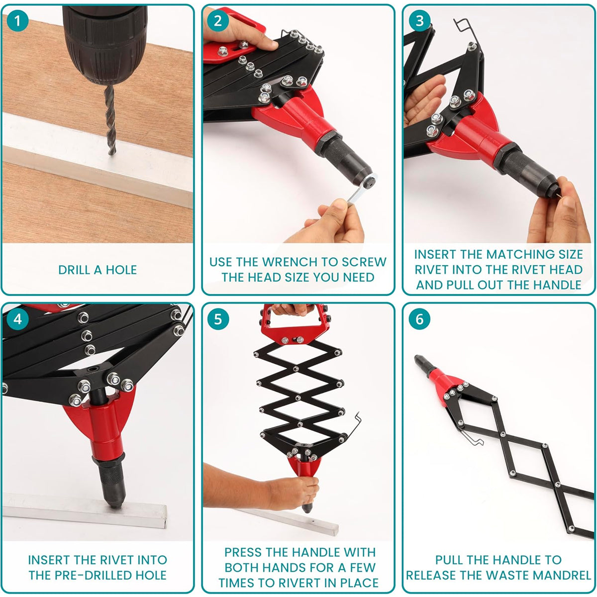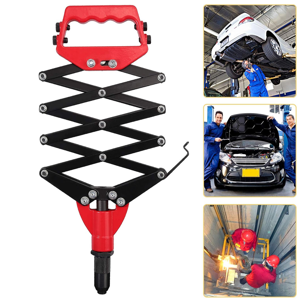 This folding rivet gun tool kit is engineered for both professional and DIY fastening on metal, wood, and plastic components. Built from heavy-duty alloy steel, it features a 4-fold joint rod design that reduces overall length for compact storage and easy transport. Five interchangeable nozzles support a wide range of blind rivet sizes, enabling efficient installation across multiple repair scenarios. The ergonomic red handle ensures a firm, comfortable grip, while a secure locking mechanism keeps the folded tool safely closed when not in use.