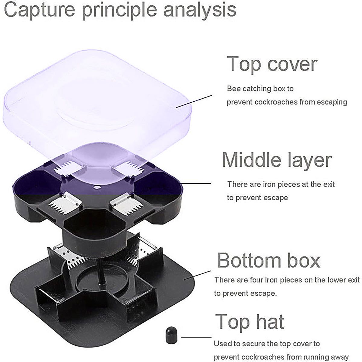 This eco-friendly pest control box provides a chemical-free solution for capturing cockroaches and similar insects. Designed with four one-way entrances, it traps pests securely without allowing escape, making it safe to use around children and pets. The transparent octagonal shape allows easy monitoring, while the durable PP construction ensures long-term use. Perfect for kitchens, garages, and storage areas, this reusable trap supports a cleaner, healthier environment.