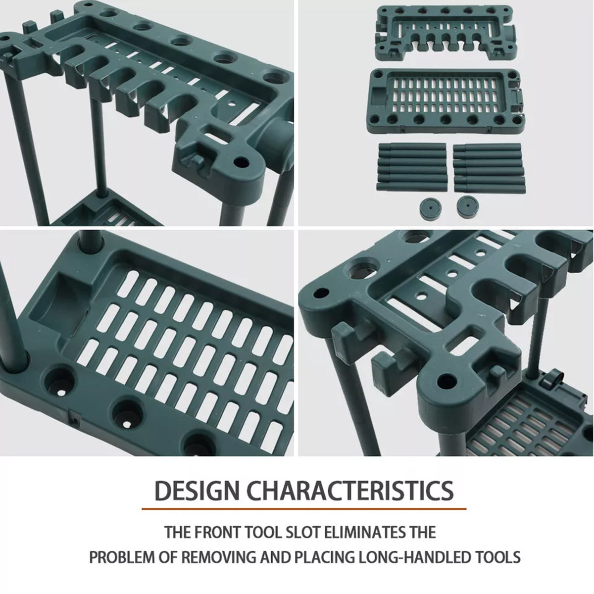 Keep your garage, shed, or garden organised with this rolling storage rack designed to hold long-handled tools such as rakes, shovels, and hoes. Vertical slots and grooved compartments provide convenient access and secure placement for a variety of tools. Made from durable plastic and equipped with wheels, this organiser is lightweight, mobile, and perfect for indoor or outdoor use.