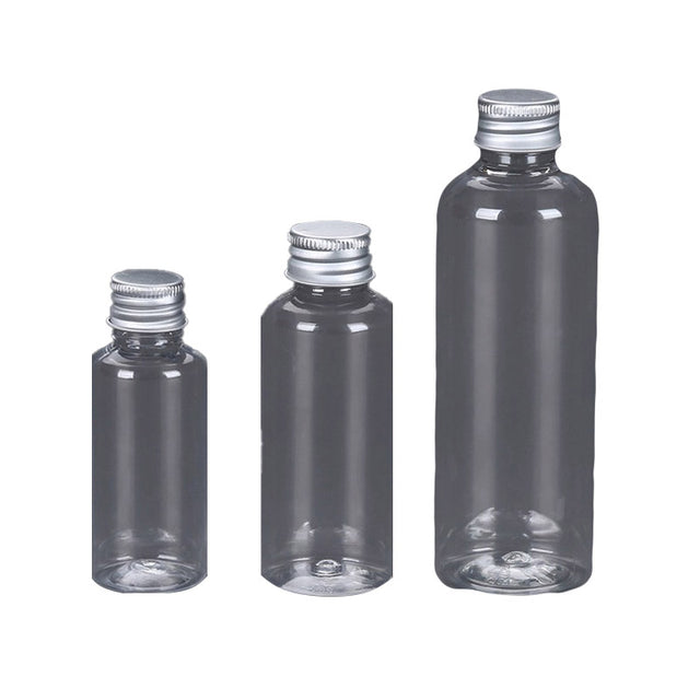Our transparent plastic bottles with aluminum caps are the perfect solution for storing and dispensing liquids, whether for travel, personal care, or DIY projects. These bottles are crafted from high-quality PET material, ensuring durability and resistance to leaks. The sleek, clear design allows you to easily see the contents inside, while the secure screw-on aluminum caps provide an airtight seal to prevent any spillage. Available in three convenient sizes (30ml, 50ml, and 100ml), these bottles are versatile and practical, ideal for a variety of uses.