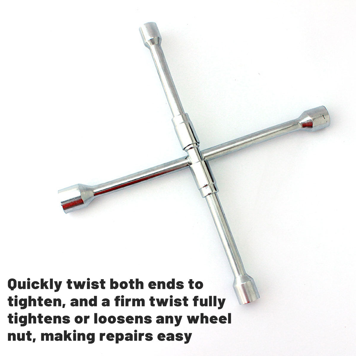 This foldable tire wrench set supports wheel removal, tightening, and roadside repair for cars, SUVs, and trucks. Constructed from carbon steel with a polished anti-rust surface, the tool resists deformation and retains structural strength under torque. A 180-degree folding mechanism enables compact storage in vehicle compartments, repair kits, or garage drawers. The included socket heads in 17mm, 19mm, 21mm, and 23mm accommodate common wheel-nut sizes, providing compatibility across multiple automotive platforms. The wrench delivers increased leverage for loosening seized wheel nuts and supports efficient wheel maintenance and tyre-change procedures.
